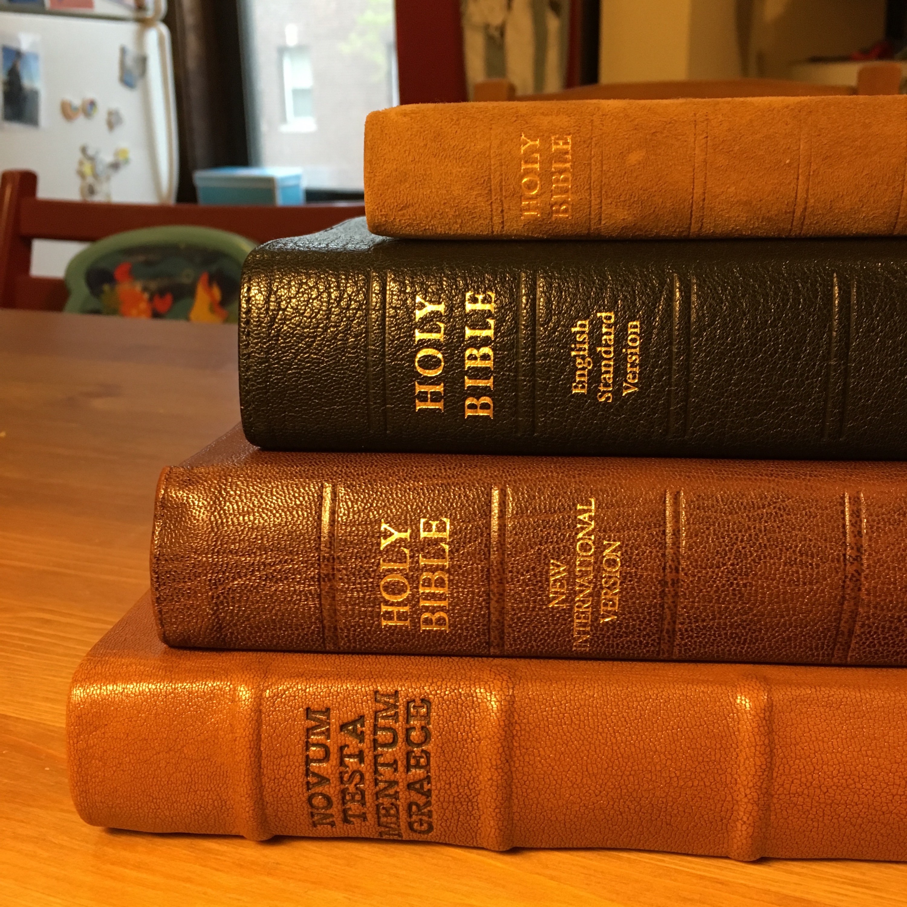 From the top: KJV pocket size snap cover, ESV Cambridge Clarion, NIV Allan, NA28 Large Print from LBRS.