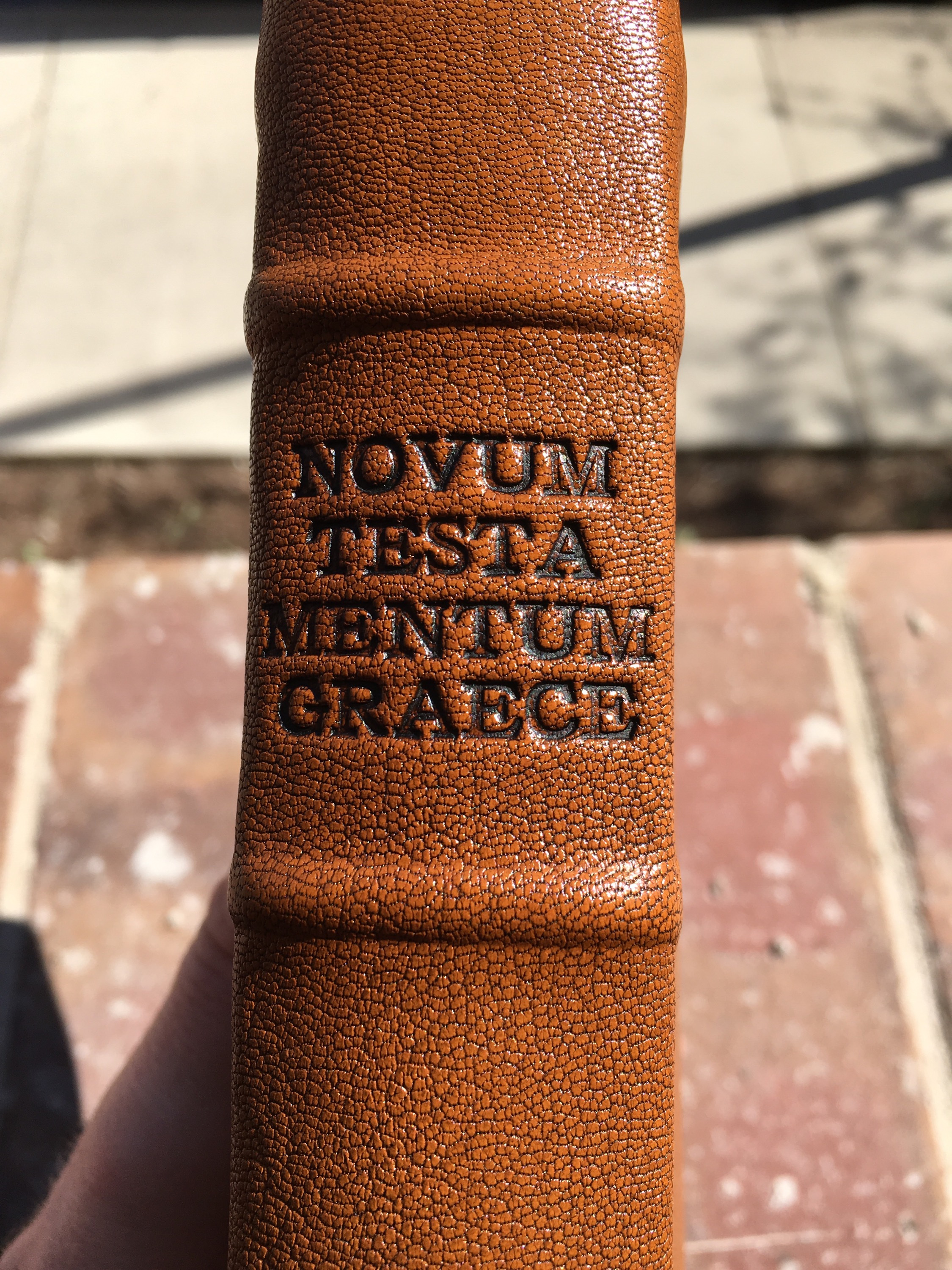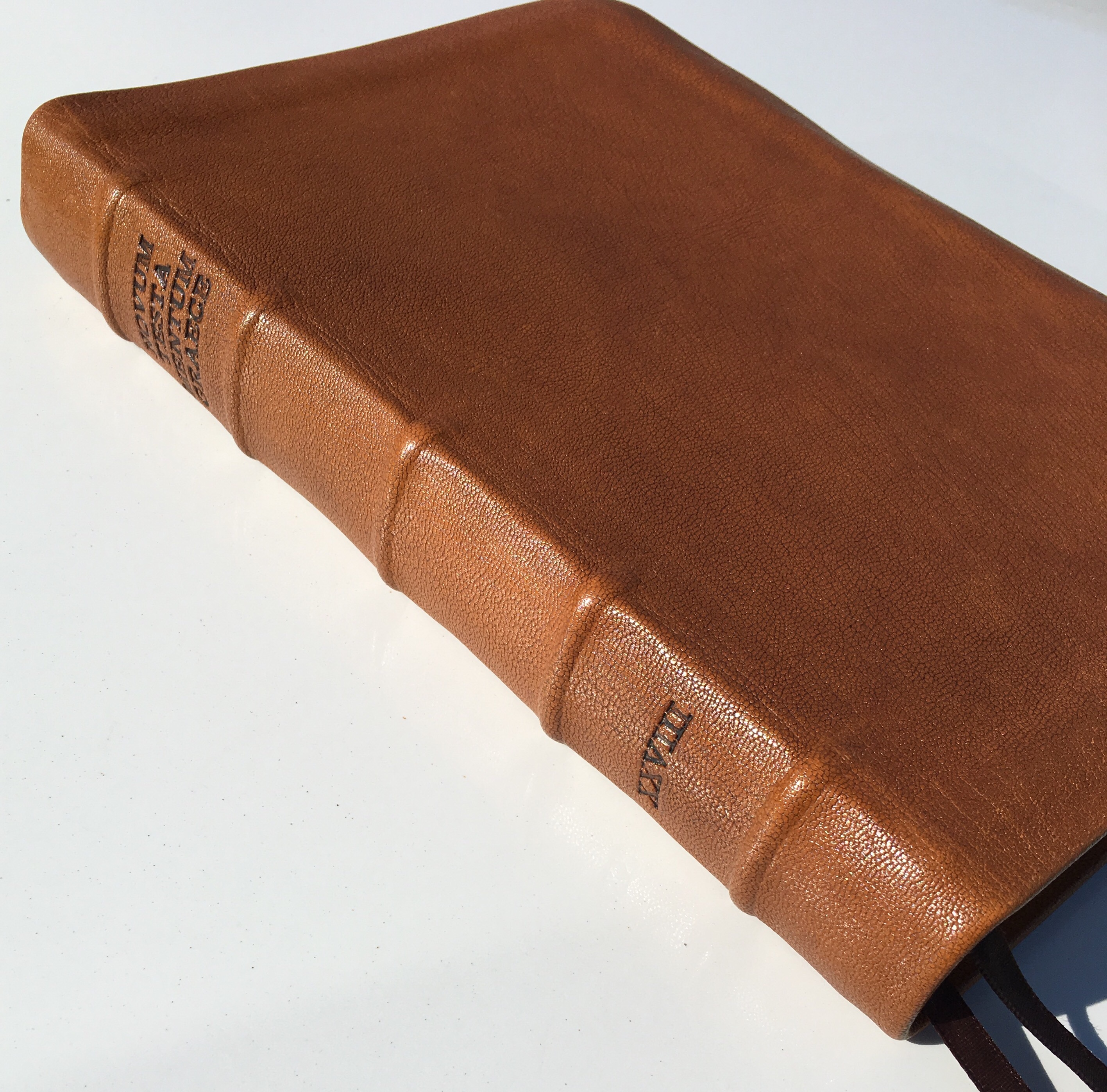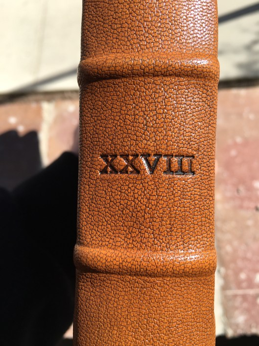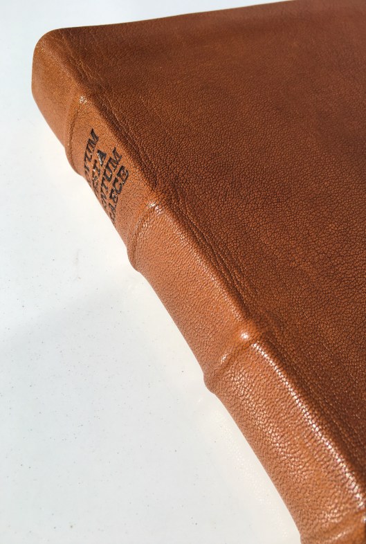 Here is a side view. I asked for the title, “Novum Testamentum Graece” to be hand-tooled into the spine, along with the Roman numeral “XXVIII” (28th edition text).